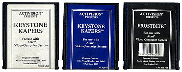 Another interesting fact here is thatin the States several "Blue-Labeled" AcTiVision games exist.They look a lot like the White-Labeled carts: white text (Roman-type font, like Times) on a darkblue background. A double-lined white border runs around the text.